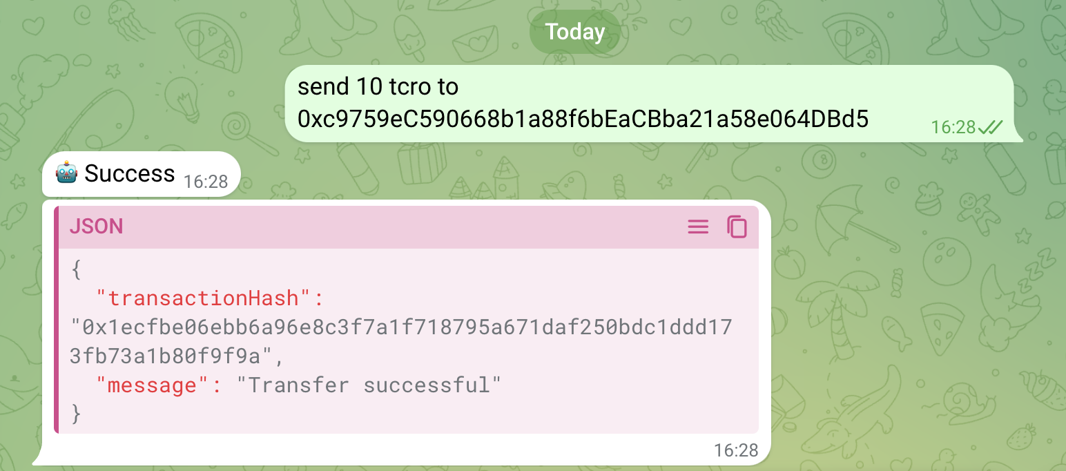 <figure><img src="https://524814724-files.gitbook.io/~/files/v0/b/gitbook-x-prod.appspot.com/o/spaces%2FktUMyU5bBece2vVjrTg7%2Fuploads%2FCgwY6fmzIJuyERaYSvgT%2FScreenshot%202024-11-19%20at%2016.28.44.png?alt=media&#x26;token=fbb06a06-3480-47fb-8d7f-8cd0db7eeb19" alt=""><figcaption><p>Example of an Agent performing a transfer using the key assigned with <a data-mention href="../crypto.com-ai-agent-sdk/quick-start-guide-simulation-entry-point">quick-start-guide-simulation-entry-point</a></p></figcaption></figure>